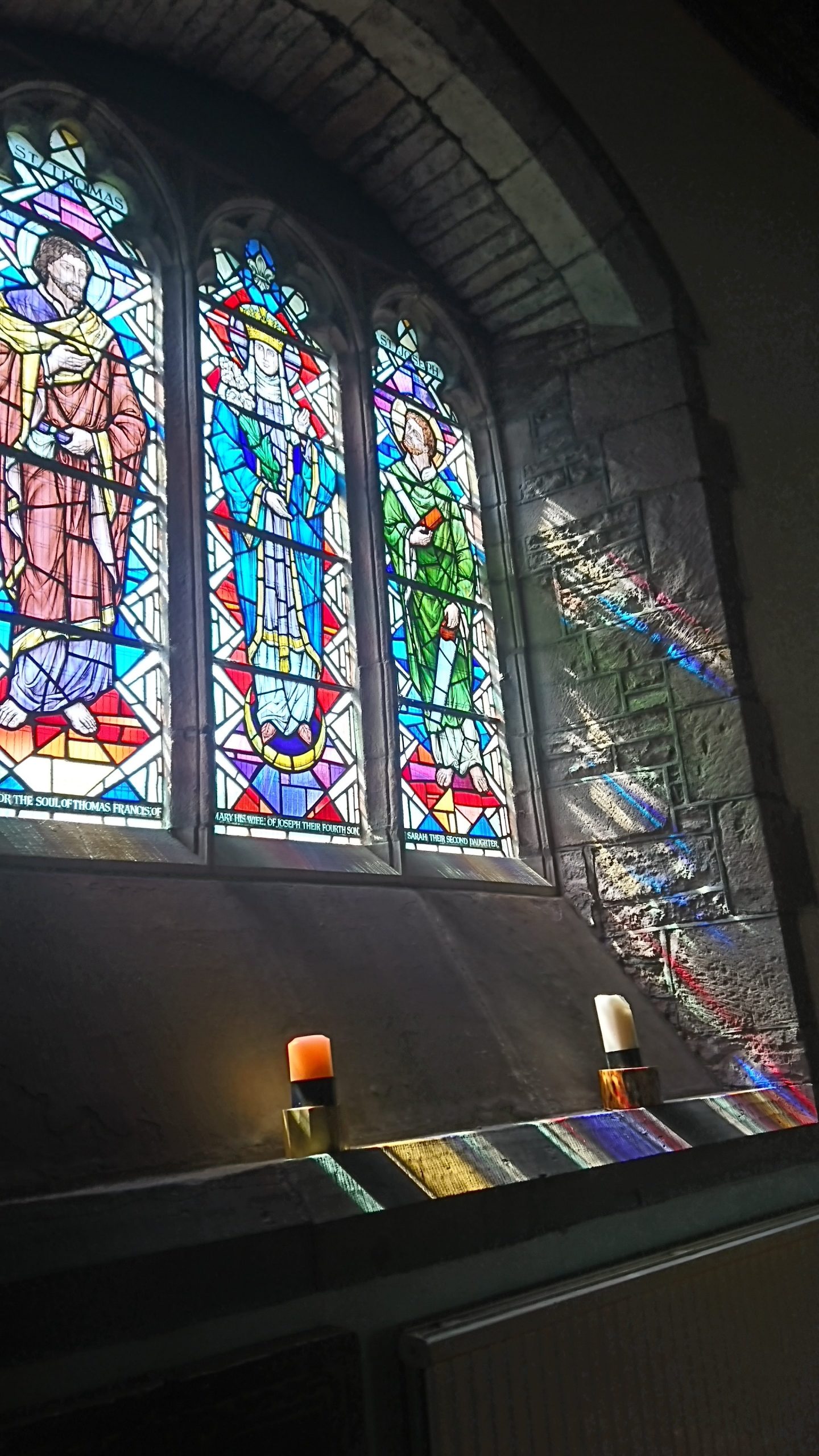 sunlight streaming through the stained glass of St Gwedolines Chrch
